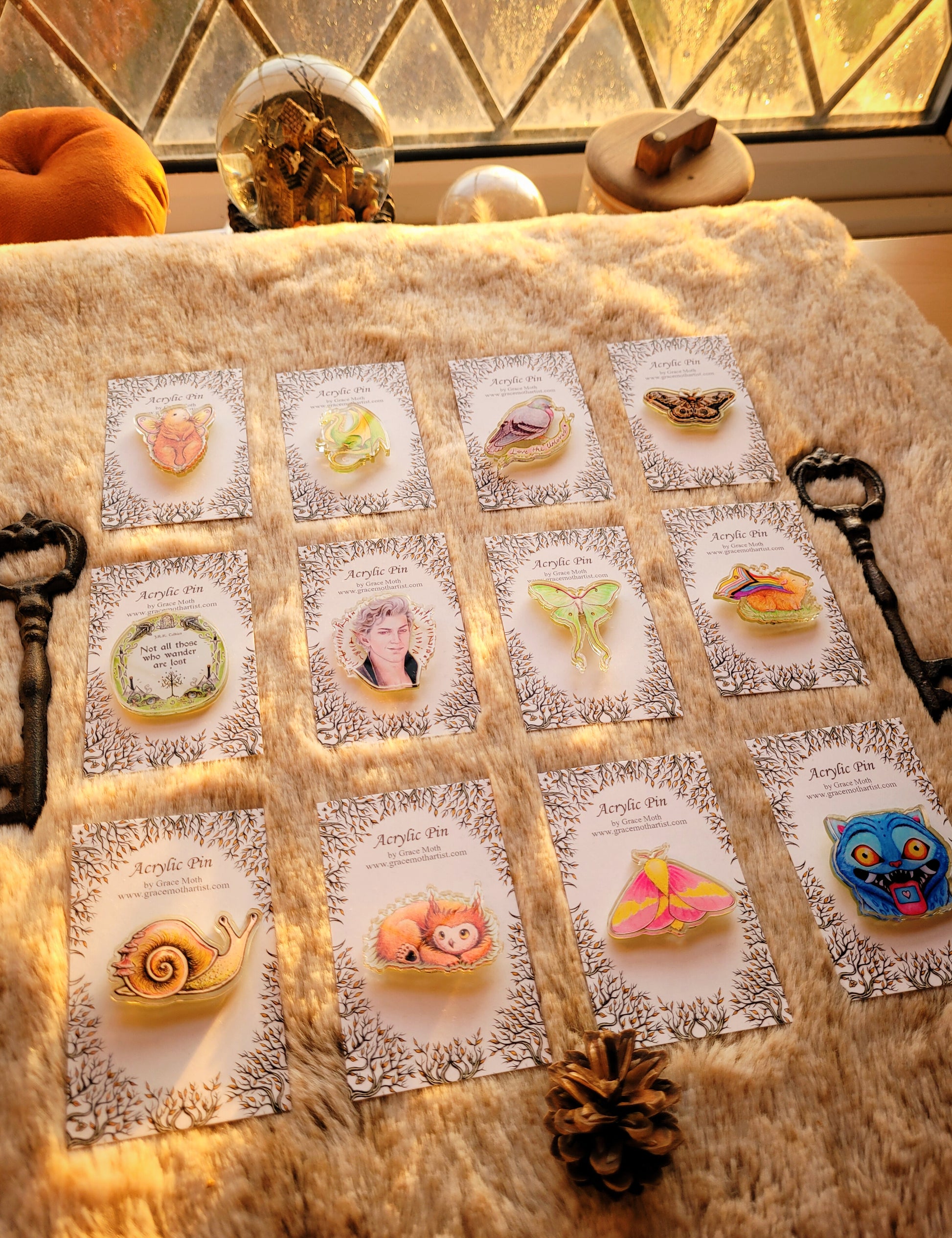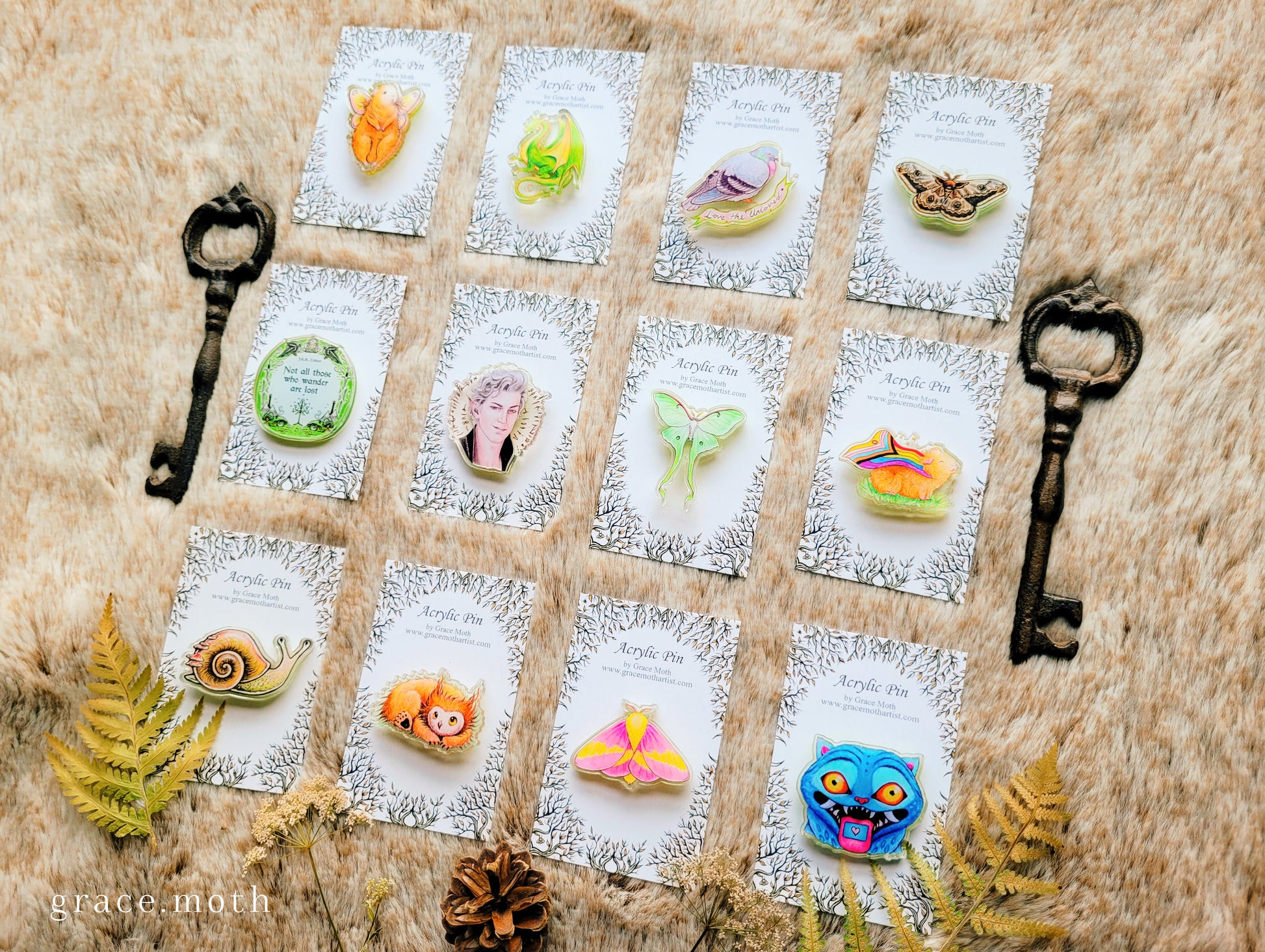 Magical pin printed with my original illustration, on eco friendly 100% recycled clear acrylic, and attached securely to a sturdy metal pin with rubber clasp.