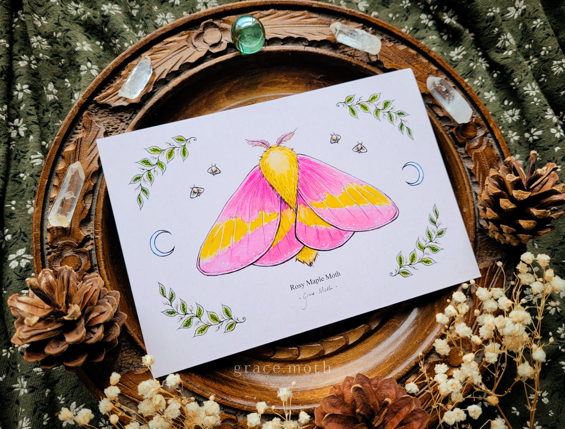Rosy Maple Moth - A6 print Illustrated by Grace Moth - 5.8 x 4.1 - Entomology