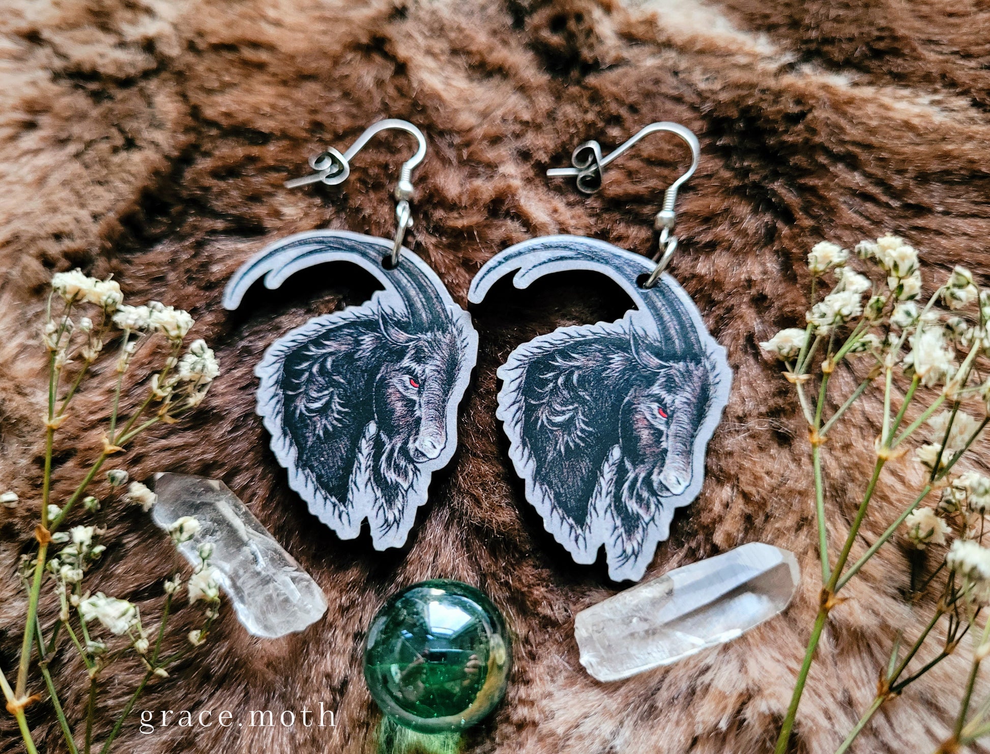 Black Phillip Goat illustrated earrings, responsibly sourced cherry wood, 304 Stainless Steel hooks, by Grace Moth