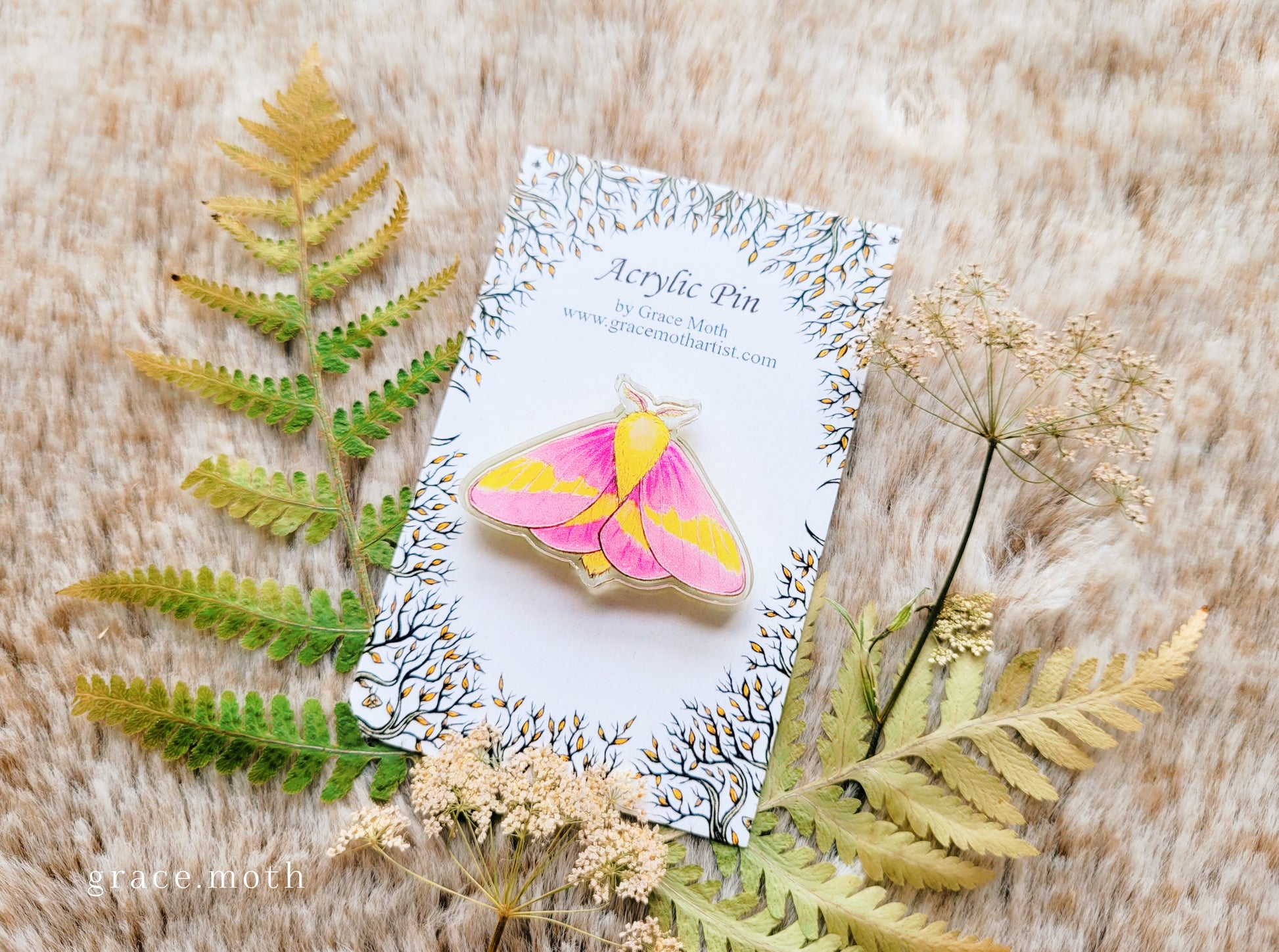 Rosy Maple pin, recycled clear acrylic, by Grace Moth - Pink Moth, Entomology