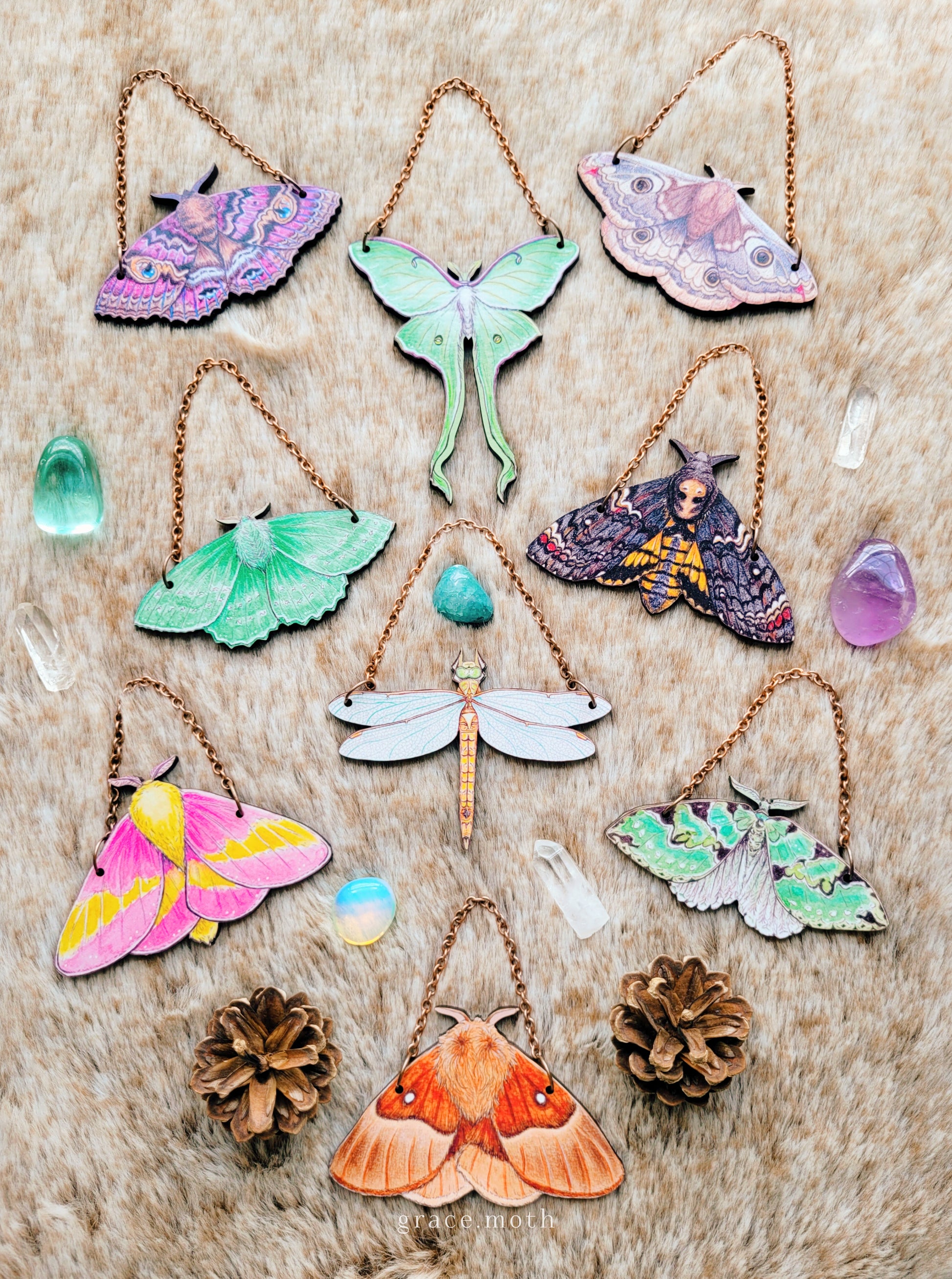Oak Eggar Moth ornament, wall hanging, 7.5cm, responsibly sourced cherry wood, illustrated by Grace Moth, Entomology